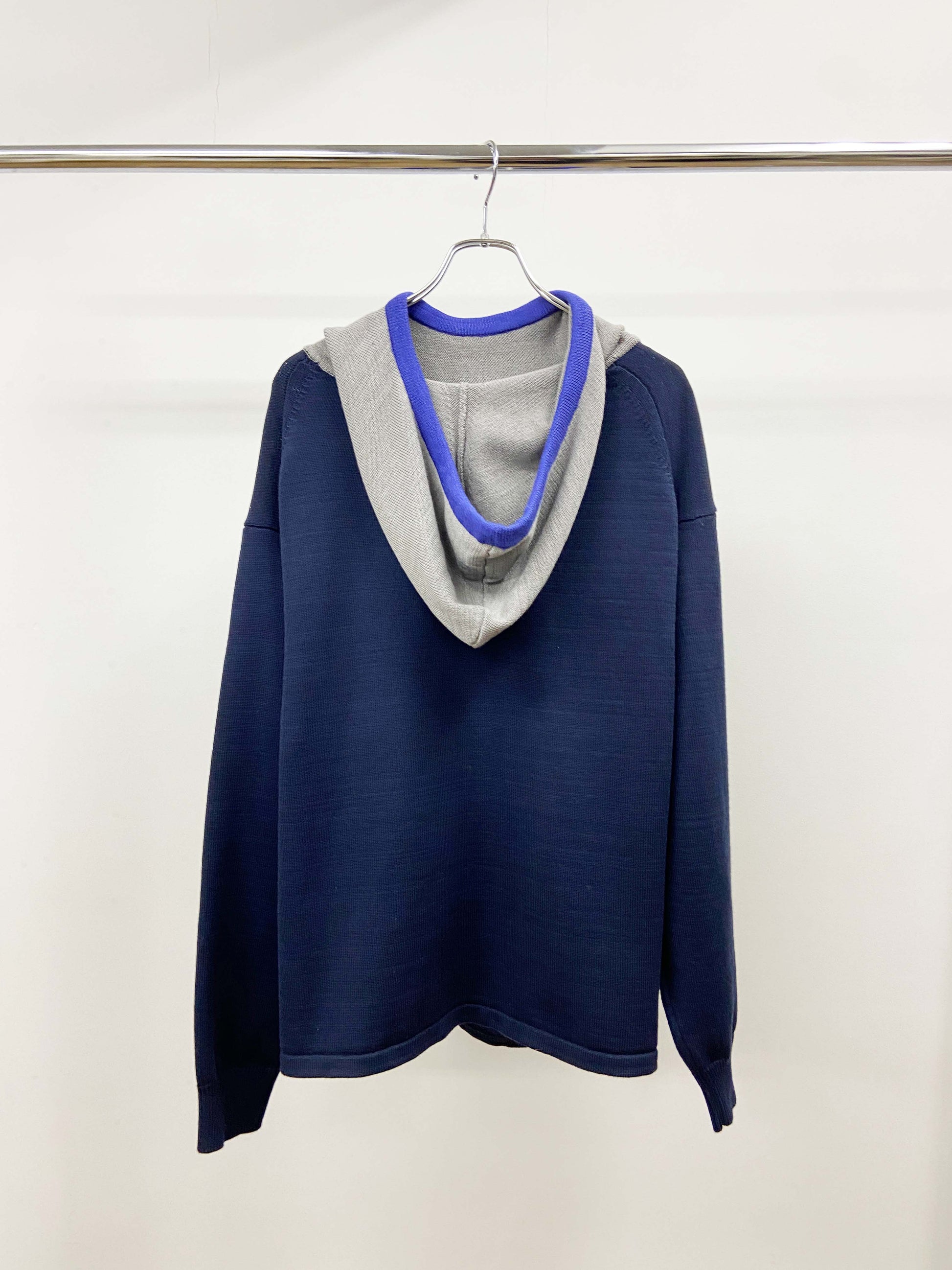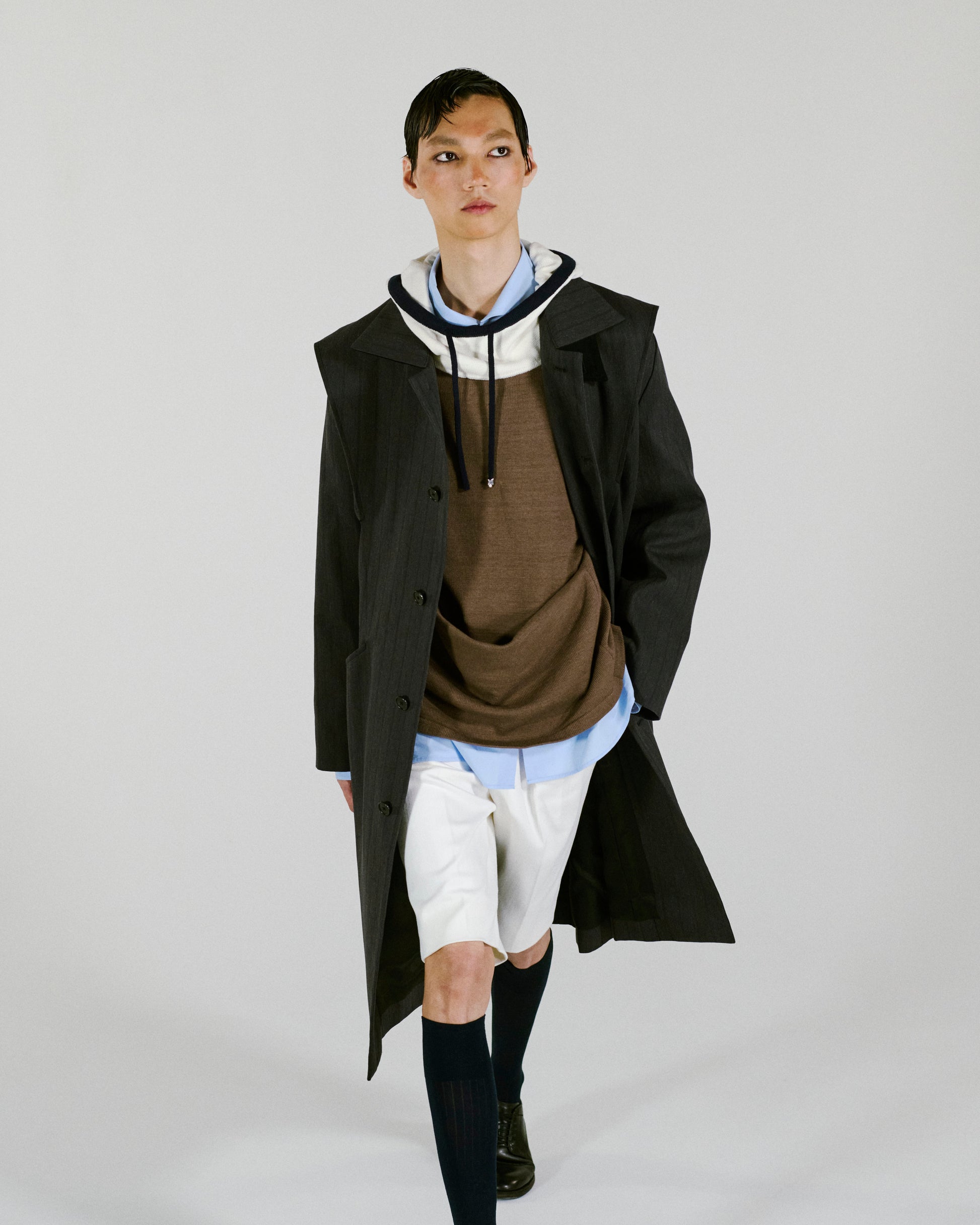 今シーズンのインスピレーション、舟越桂の彫刻にみられる、特徴的なネックラインや肩のラインを想像し、緩やかなドレープ感のあるネックライン、ポケットもカンガルーのような形で、自然とドレープが生まれるデザインになっています。ネックラインとポケットラインがリンクするようにデザインしています。インナーにシャツを着たり、タートルネックと合わせたり、色々な楽しみ方ができます。素材もコットンシルクの糸を使用し、肌触りの良さと、ドレープ感が強調されます。素材感や厚さも幅広いシーズンで着用していただけます。