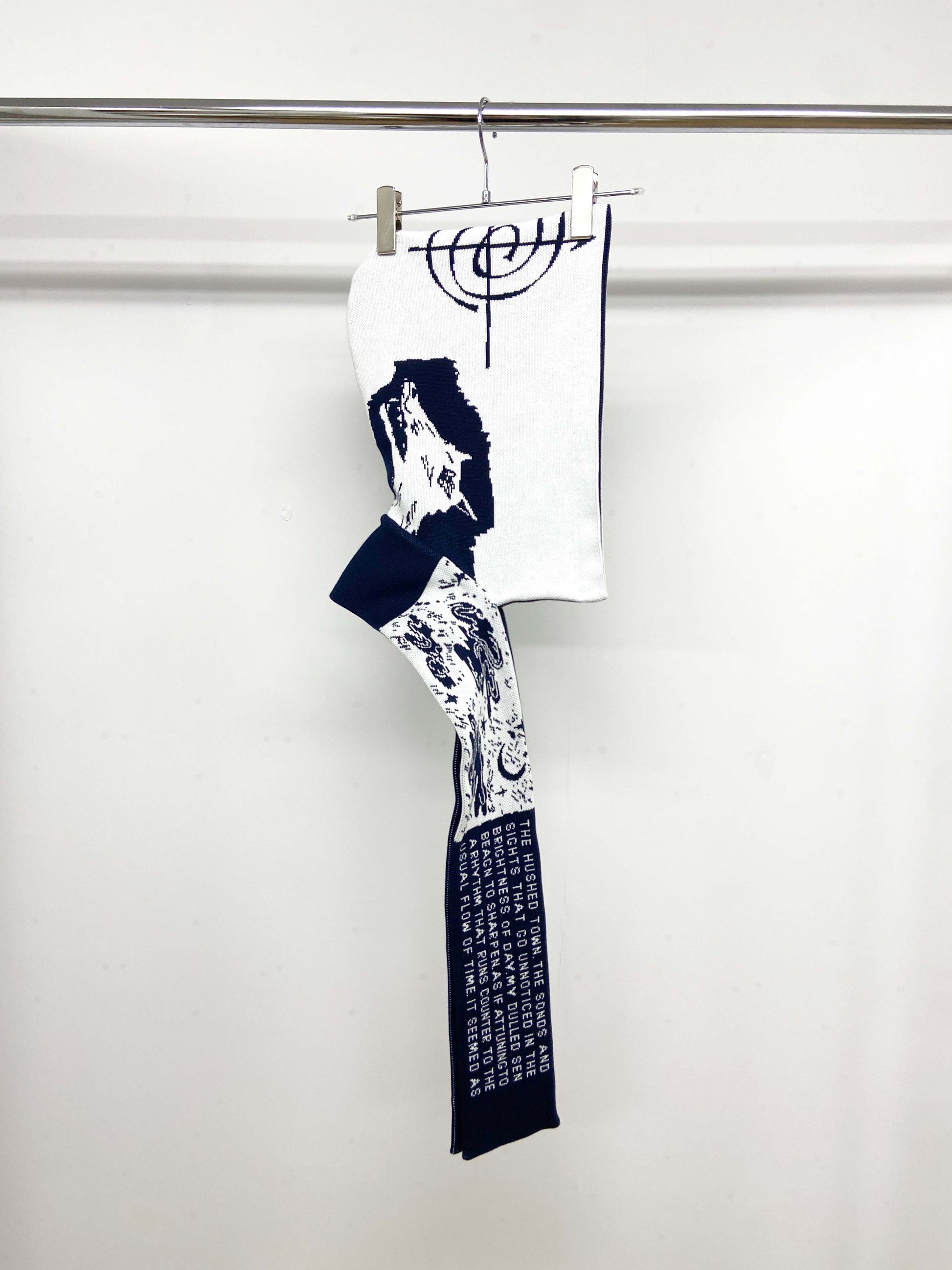 舟越桂の日記の中にあったストーリーを元に、夜の散歩をキーワードにデザイナー自身が描いたイラストレーションをジャガードニットで表現しました。全パネルで異なる表情を持っています。フードとマフラー両方の機能を持ち合わせています。つけフードとしても着用いただけます。リバーシブル仕様。