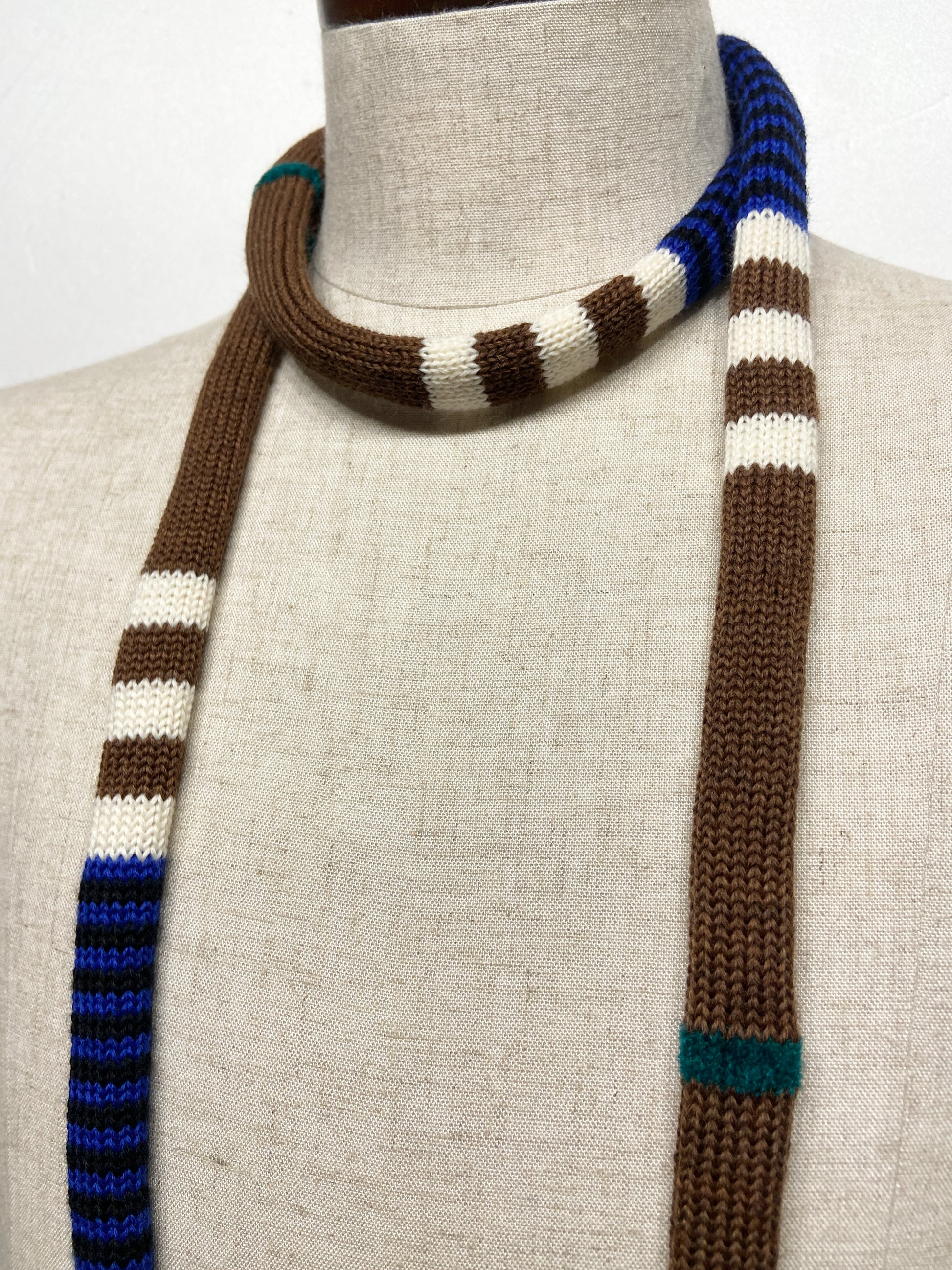 太さ約2cmのマルチボーダータイ。長さ約160cm。ウール素材。全て柄と色の組み合わせが異なるアイテムです。1本でスタイリングしてタイの様に使用していただけます。2本組み合わせてマフラーのような使い方もおすすめです。