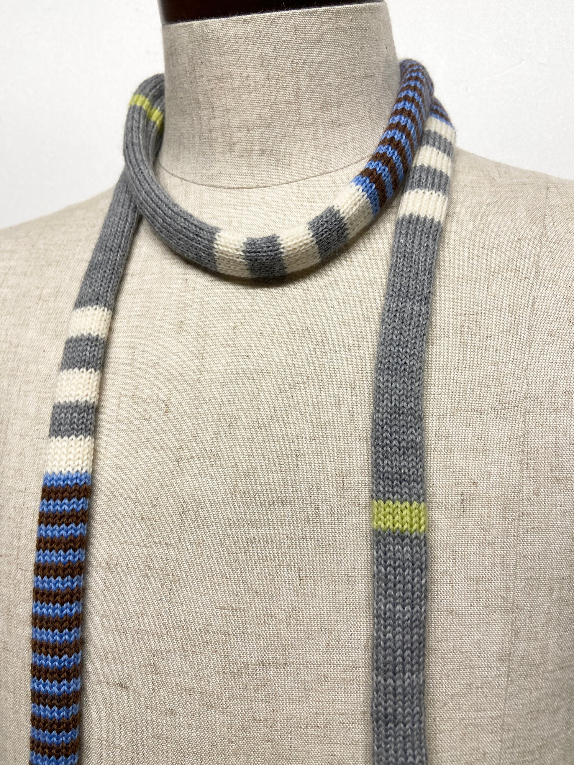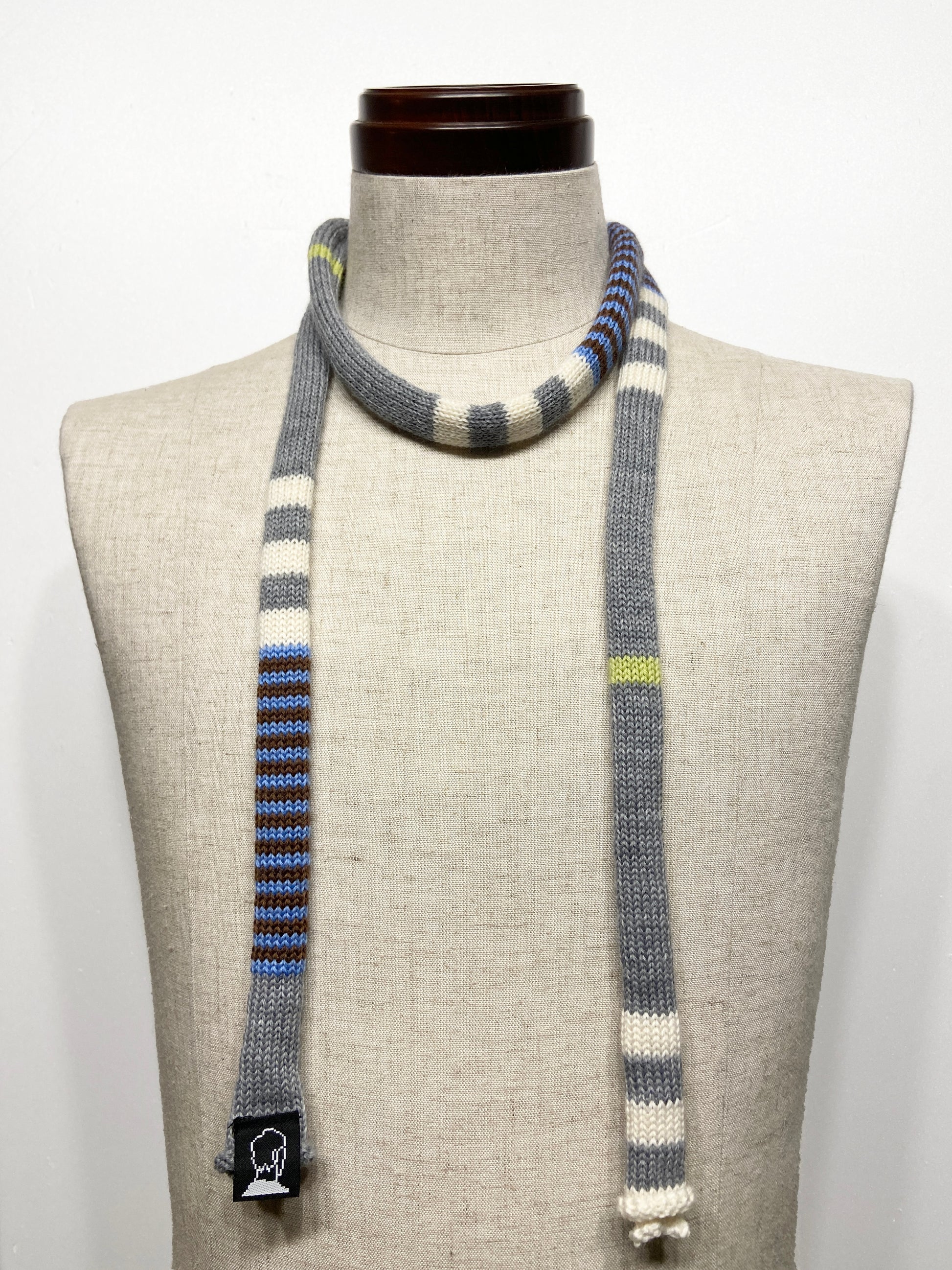 太さ約2cmのマルチボーダータイ。長さ約160cm。ウール素材。全て柄と色の組み合わせが異なるアイテムです。1本でスタイリングしてタイの様に使用していただけます。2本組み合わせてマフラーのような使い方もおすすめです。